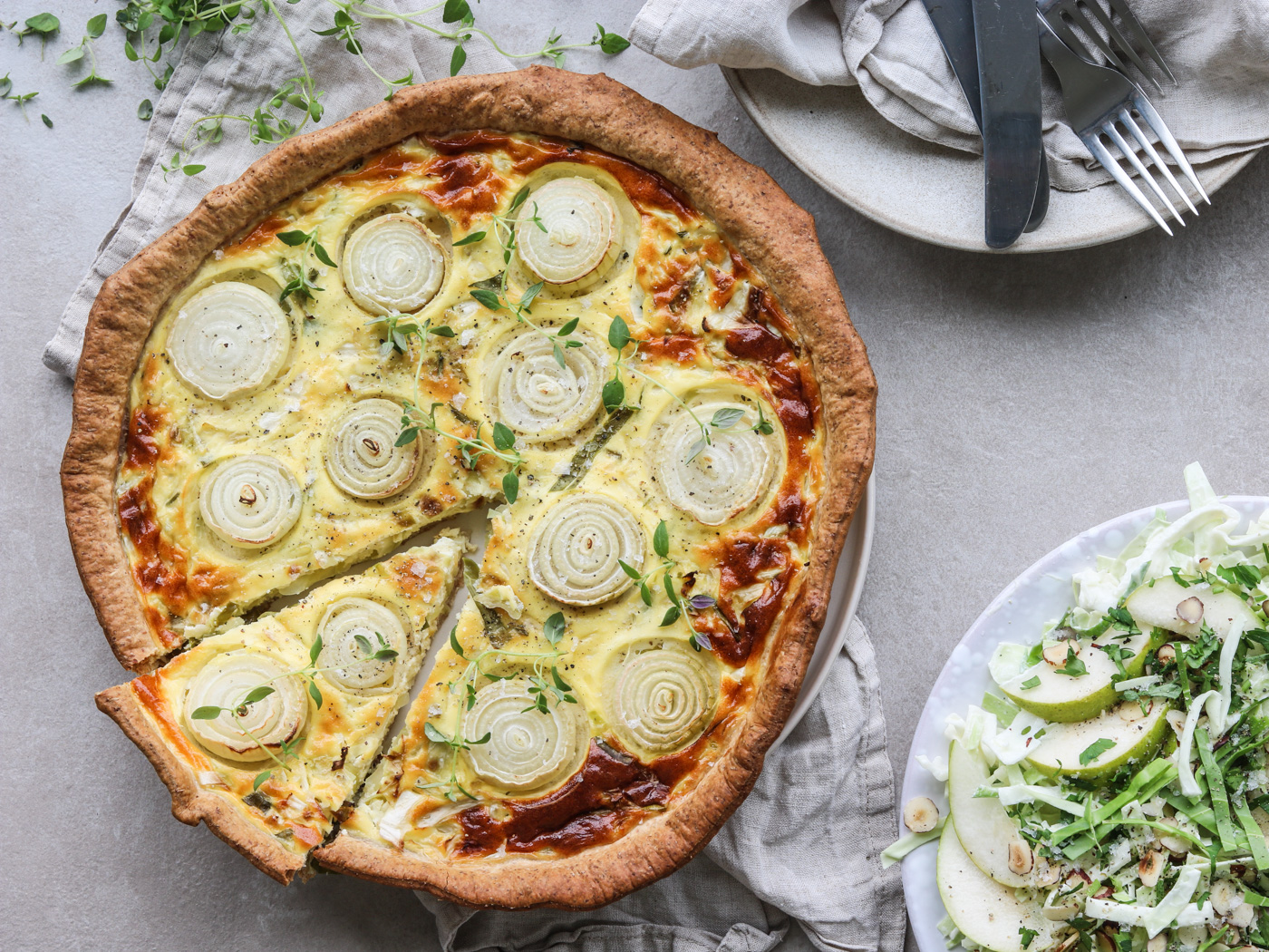 minutesVidunderlig vegetartærte med masser af smag fra aromatiske danske løg og sødmefuld spidskål